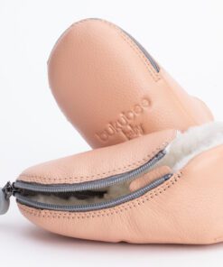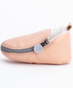 A light pink genuine leather bootie lined with soft faux fur that’s stylish for early walkers.