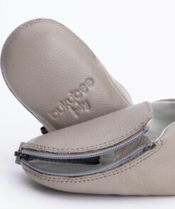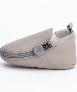 A light gray genuine leather bootie lined with soft, white microfiber that’s stylish for both baby girls and boys.
