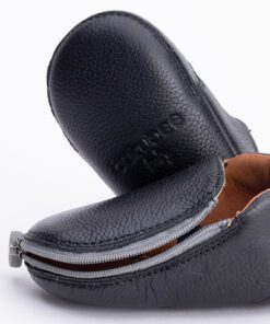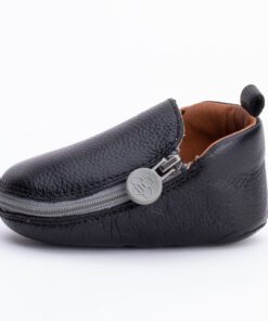 A black genuine leather bootie lined with soft, dark tan microfiber that’s stylish for both baby girls and boys.