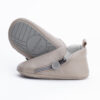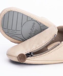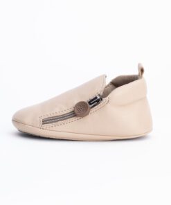 A beige genuine leather bootie lined with soft, beige microfiber that’s stylish for both baby girls and boys.